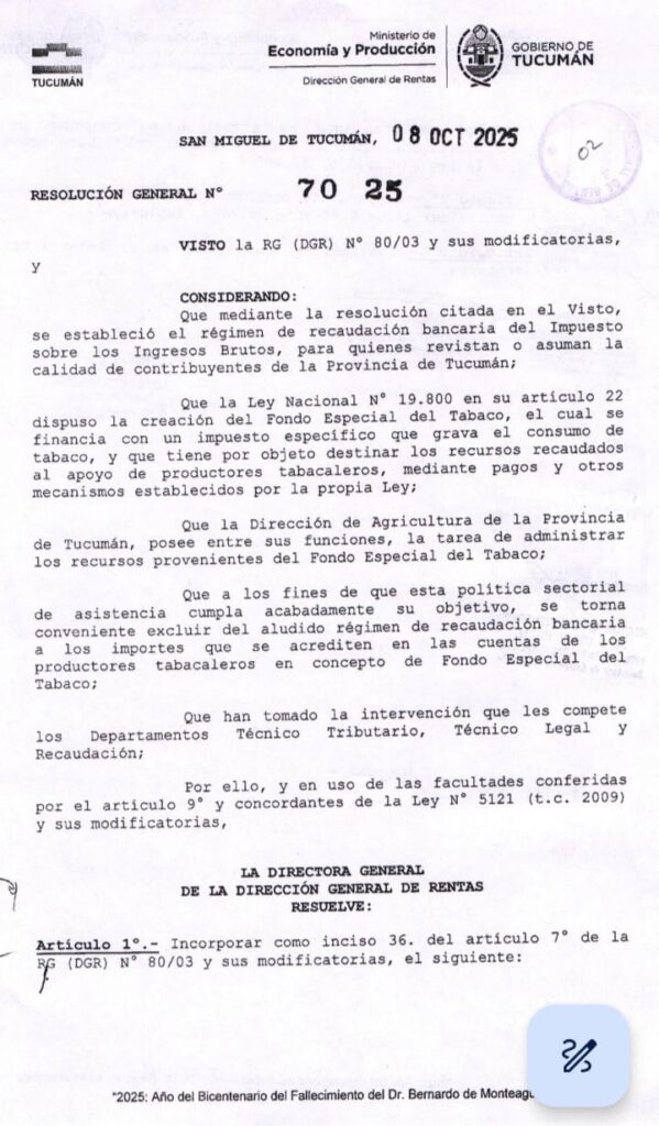 Finalmente, la Dirección General de Rentas emitió la Resolución General N° 70/25 como respuesta favorable a la solicitud realizada por los representantes del sector tabacalero.