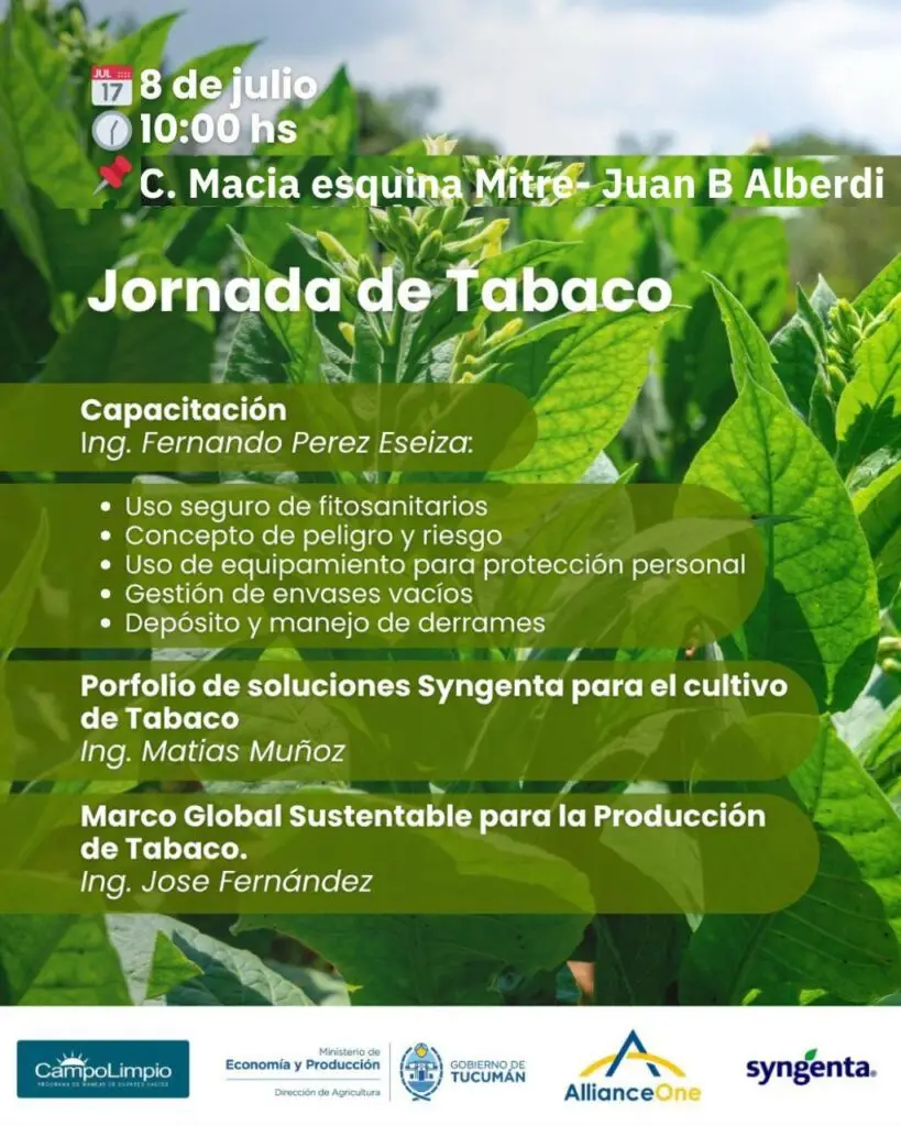 3 de Julio de 2025 Participa de la jornada de tabaco La Dirección de Agricultura de la provincia invita a los interesados a participar de la «Jornada de Tabaco», a realizarse el día 8 de julio en Juan Bautista Alberdi Ubicacion: Córdoba 1039 San Miguel de Tucumán secdesarrolloproductivo@tucuman.gov.ar
