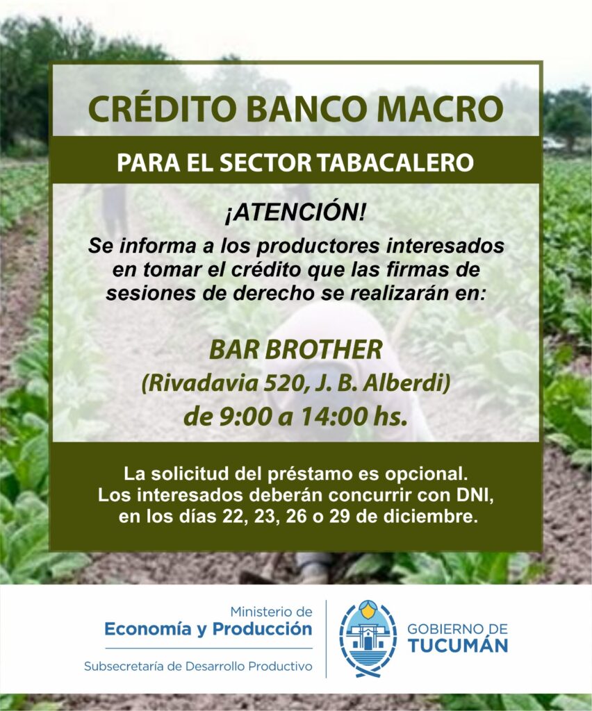 La Subsecretaría de Desarrollo Productivo, a cargo del Ing. Martin Lazarte y dependiente de la Secretaría de Estado de Producción que encabeza el Med. Vet. Eduardo Castro, gestionó ante el Banco Macro un crédito por $1.500.000.000 que se encontrará disponible para solicitud del sector tabacalero.